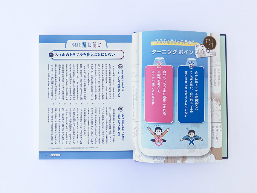 子ども達のスマホトラブルや解決法を漫画を交えつつ解説するガイドブック。
