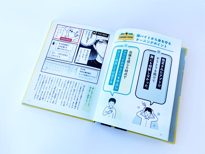闇バイトの実例を漫画で学び、具体的な防止策を伝える学習書。